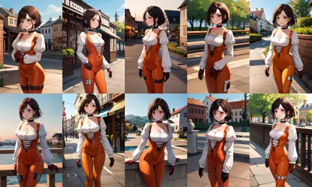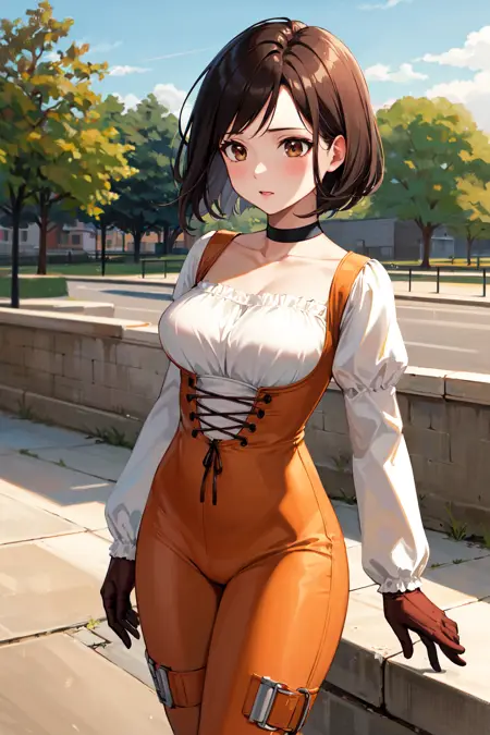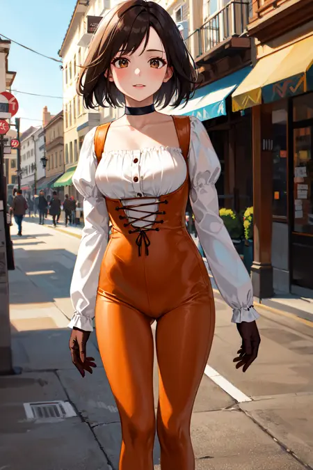 衣装1(短い髪)aagarnet, 短い髪, 茶色の目, チョッカー, オレンジ色のボディスーツ, パフスリーブ, 長い袖, グローブ
