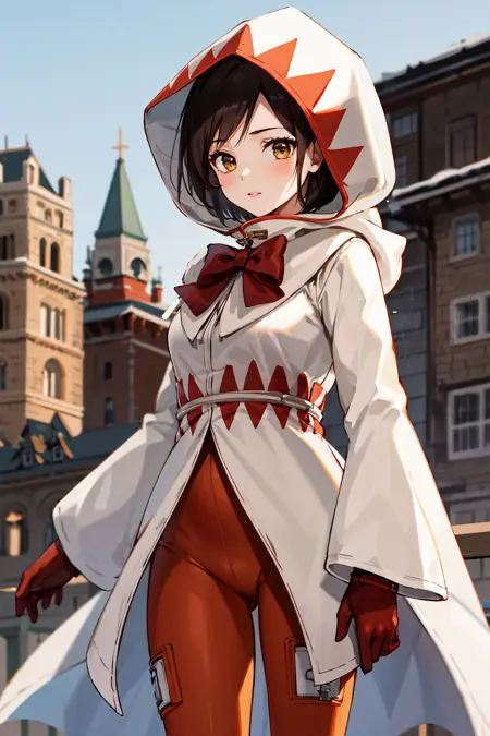 衣装2aagarnet, 短い髪, 白魔術師, フードを被った, 赤いリボン, (ローブ:1.2), 長い袖, スキントight, グローブ