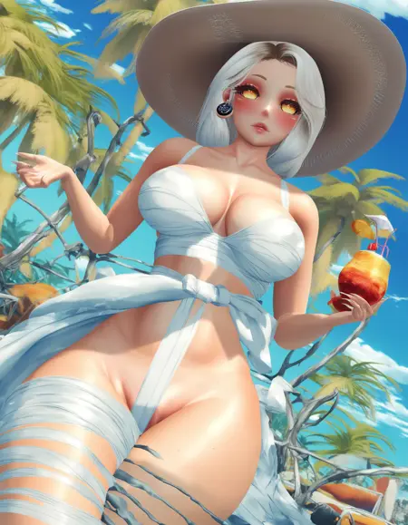 キャラクタープロンプト:ほくろ、まつげ、黄色い目、くびれ、豊満、Second Life、白髪、ロングヘア