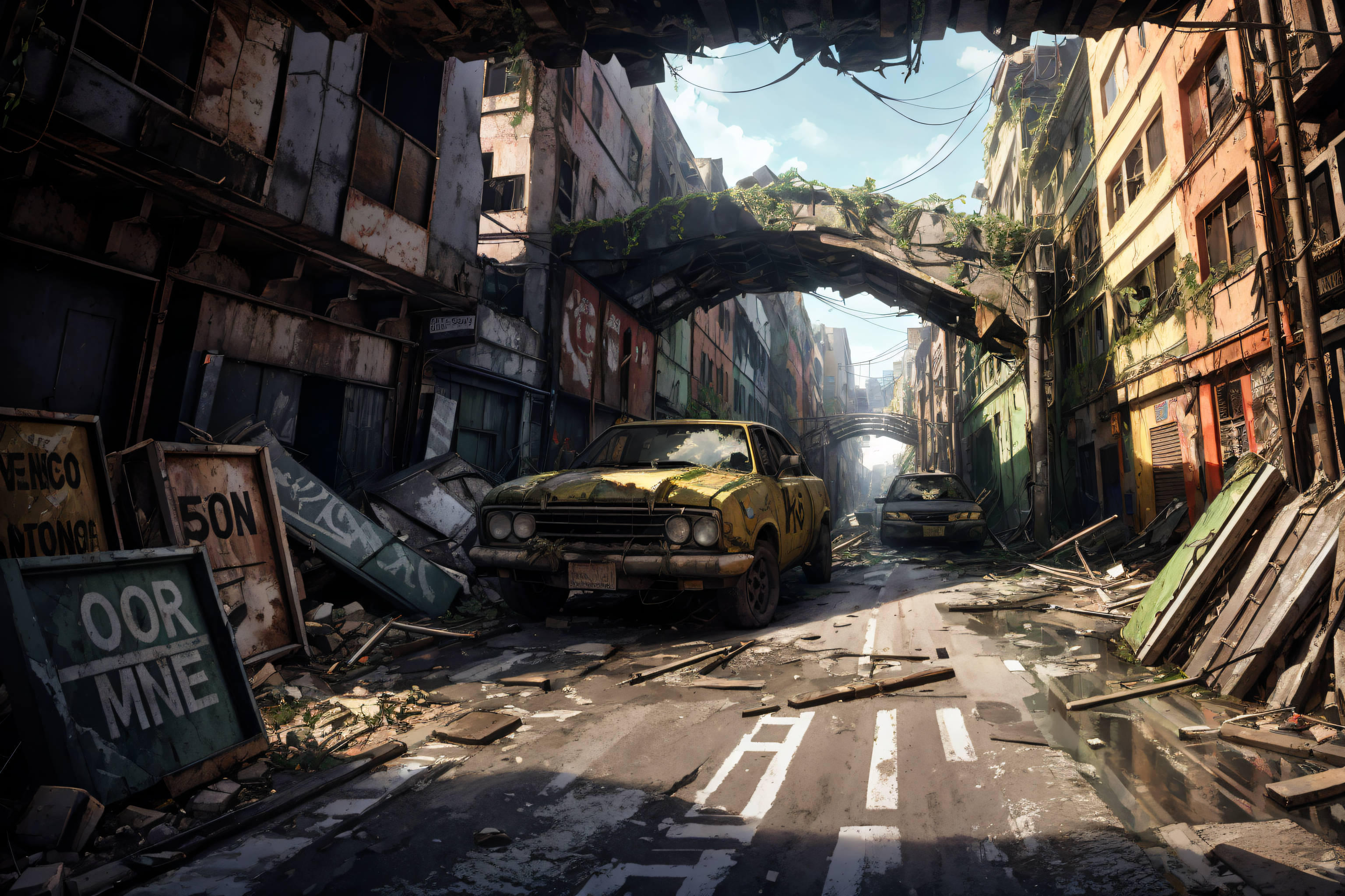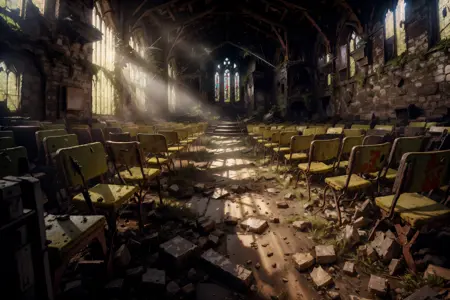 在一座末日崩塌的电影院里,海报撕裂,投影仪积尘,座椅破损,屏幕歪斜。