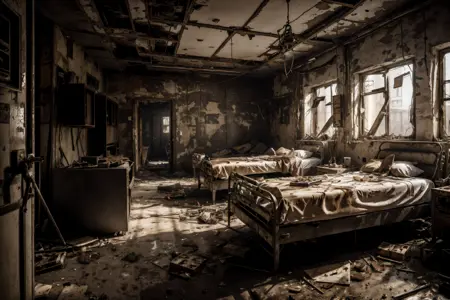 在一座末日寂静的病房里,床单染污,医疗设备积尘,空气中残留着消毒水的气味。