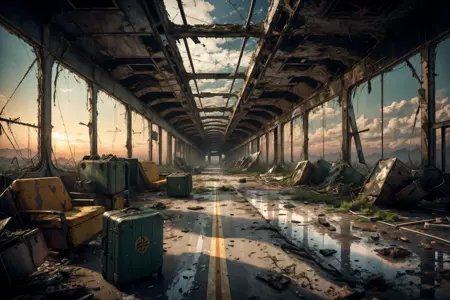 在一座末日废弃的火车站,长椅生锈,信息牌开裂,废弃的列车上布满涂鸦。