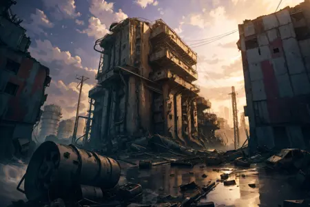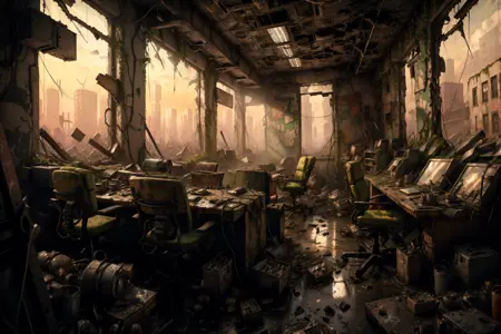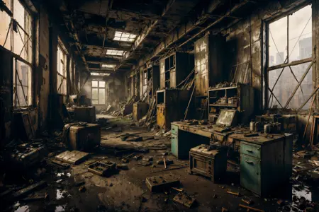 在一座末日的工厂中,机器生锈,窗户破碎,废弃材料堆积,控制室被毁。