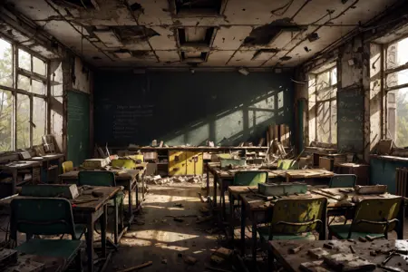 在一座末日废弃的教室中,课桌翻倒,黑板积满灰尘,课本泛黄。