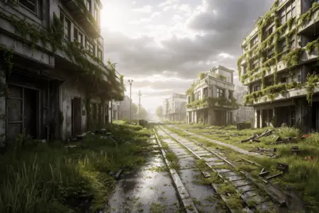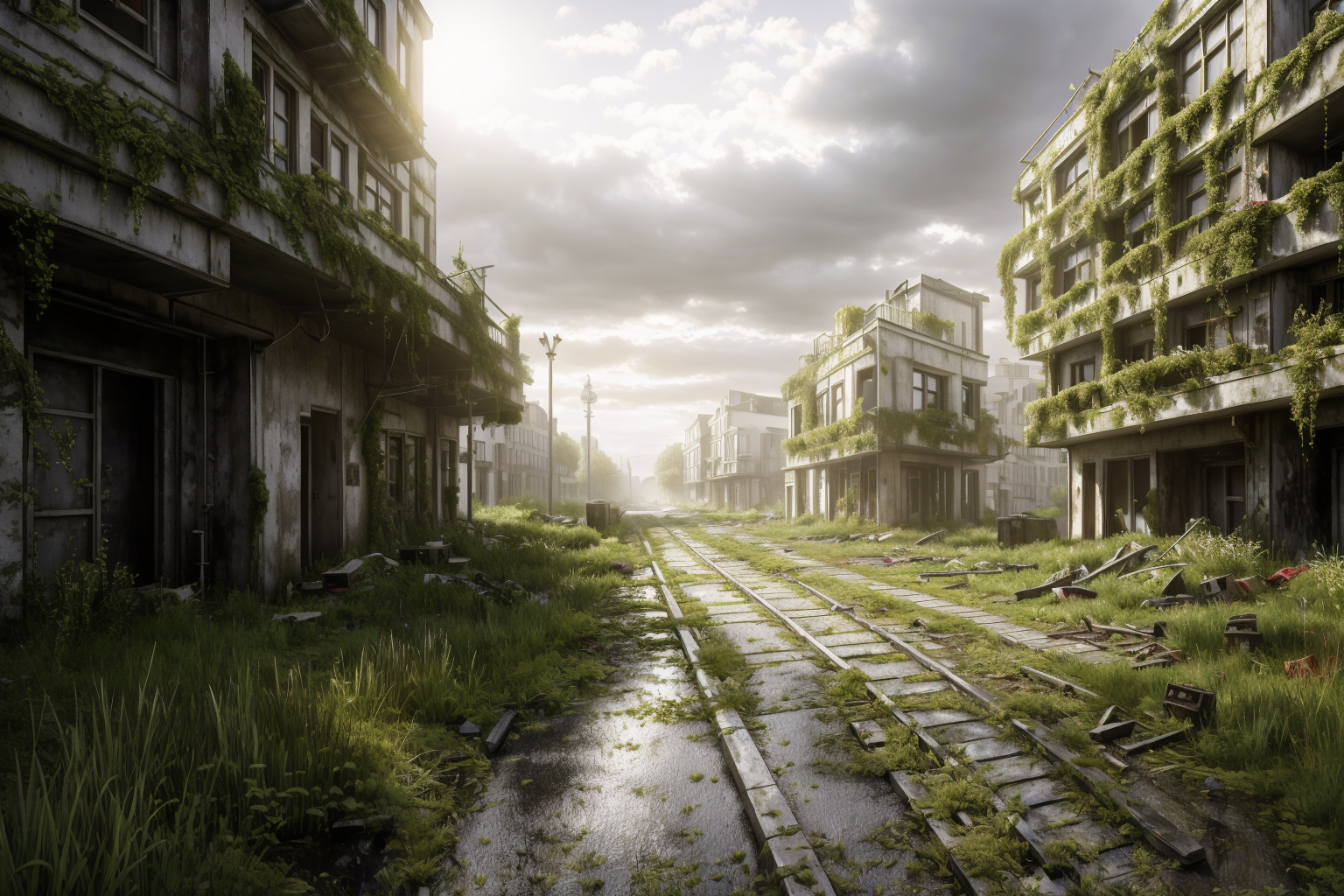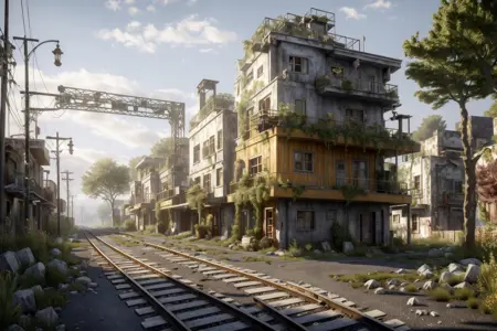 on a post-apocalyptic deserted train station, rusting benches, cracked information board, graffiti-covered abandoned train.