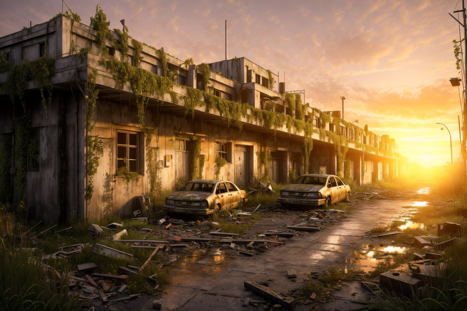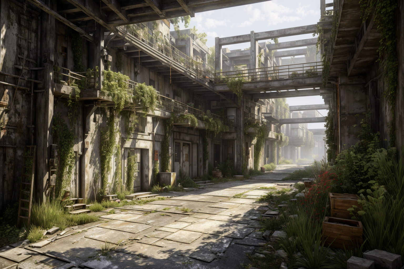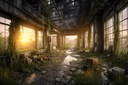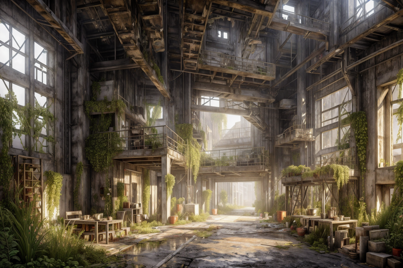 in a post-apocalyptic factory, rusting machinery, broken windows, discarded materials, smashed control room.