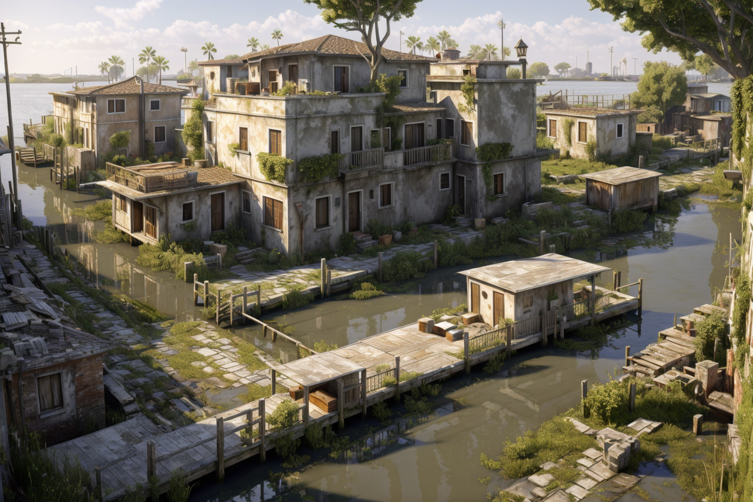 on a post-apocalyptic kitchen, scattered rusted pots, cracked dining table, moldy open refrigerator.