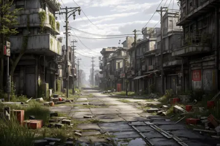 on a post-apocalyptic supermarket, empty shelves, scattered trolleys, broken glass, decaying food packaging.