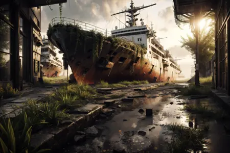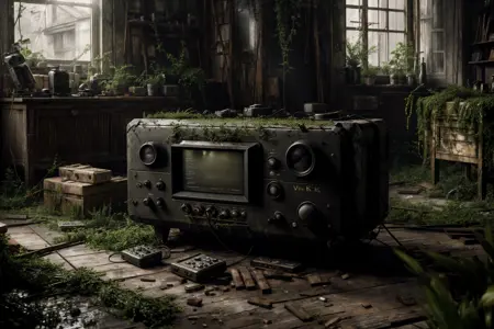 在一座末日后的厨房里,散落着生锈的锅具,餐桌开裂,冰箱门敞开,内里发霉。