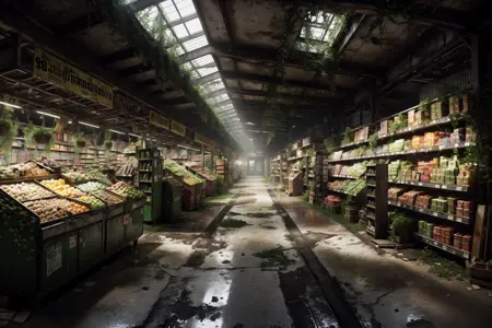 在一座末日的超市里,货架空空,购物车散落,玻璃碎裂,食品包装腐烂。