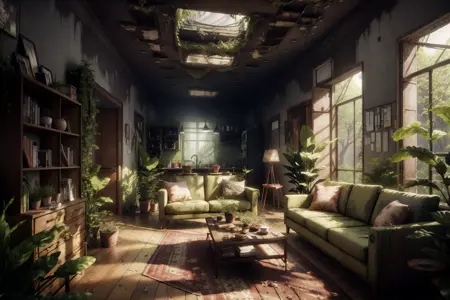 在一座末日后的客厅里,沙发撕裂,电视破碎,褪色的家庭照片,地毯磨损。