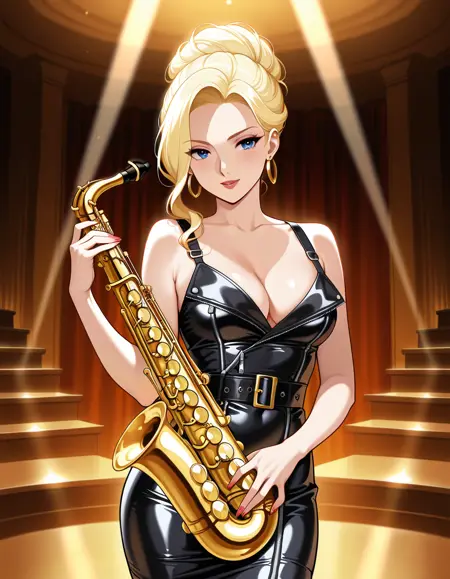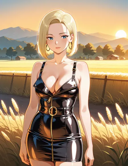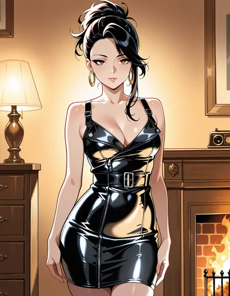 hud_motodrss, black dress, belt, zipper, bare shoulders, breasts, cleavage, skin tight,