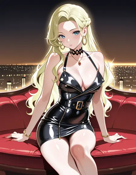 hud_motodrss,黑色短裙,腰带,拉链,裸露肩膀,中等大小乳房,乳沟,紧身