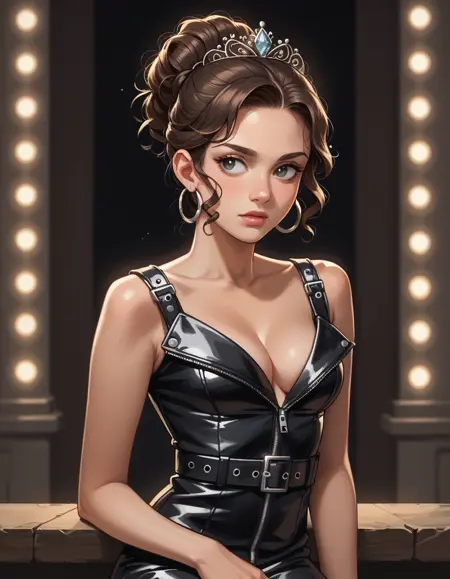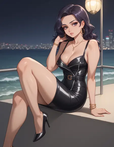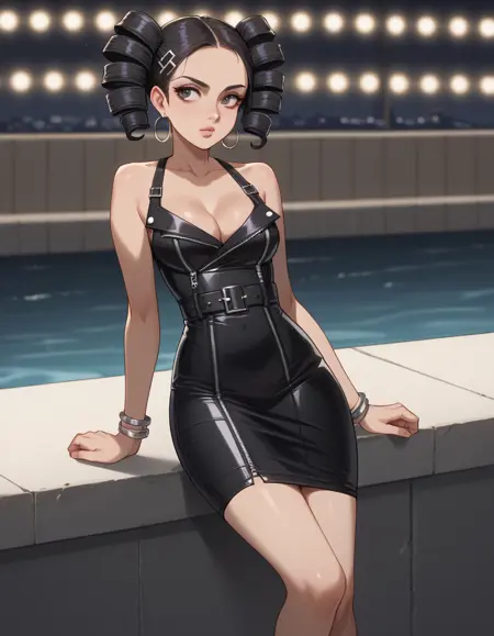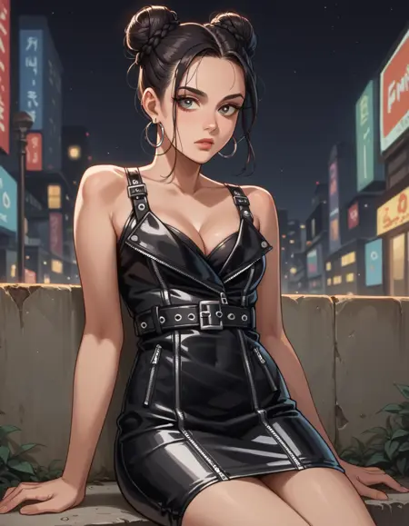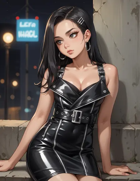 hud_motodrss, short black dress, belt, zipper, bare shoulders, medium breasts, cleavage, skin tight