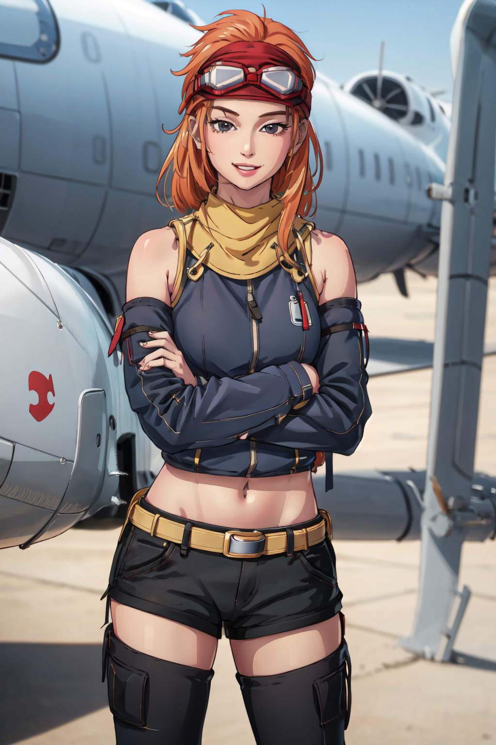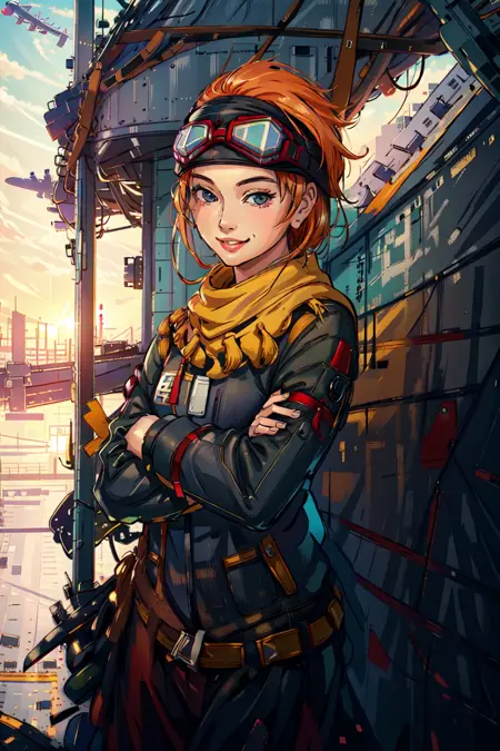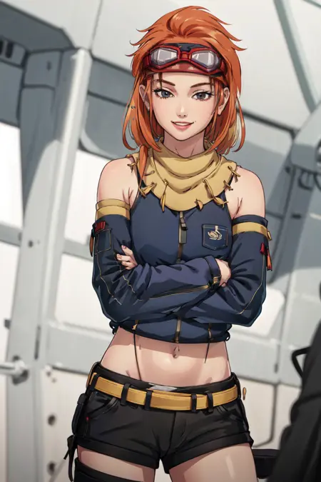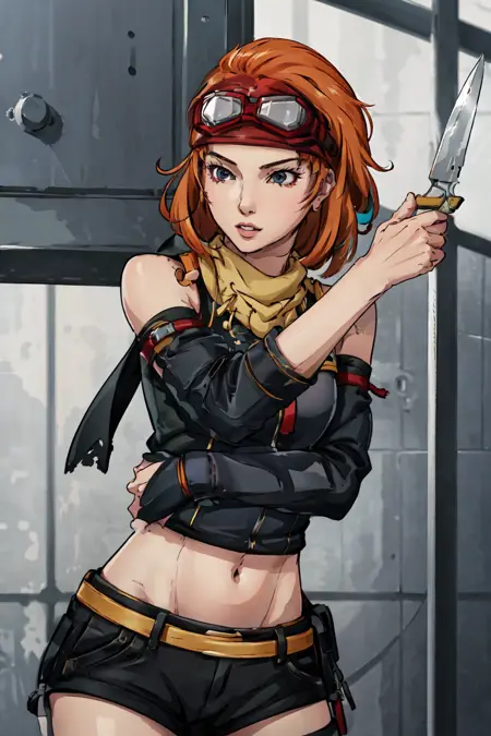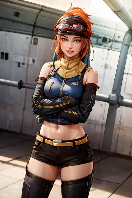 CO Tasha from Advance Wars: Days of Ruin. TashaAW is the trigger phrase. Prompts like "Goggles on head, midriff, shorts, and Thighighs" are essential for duplicating her ingame appearance.