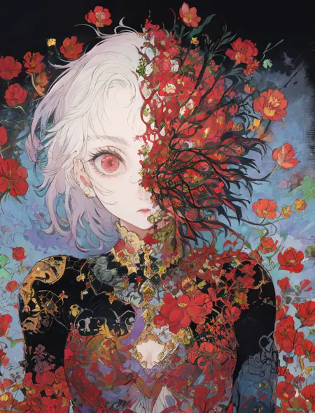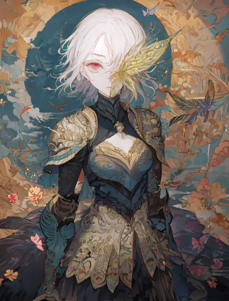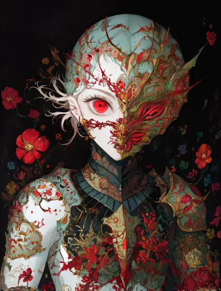“触发词”:女性、暗色背景、亮色背景、多彩、盔甲、花朵盔甲、花朵、虹彩盔甲、多彩背景、[颜色]连衣裙