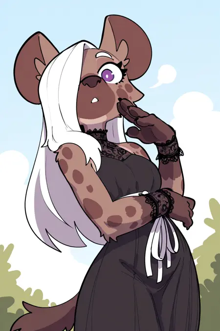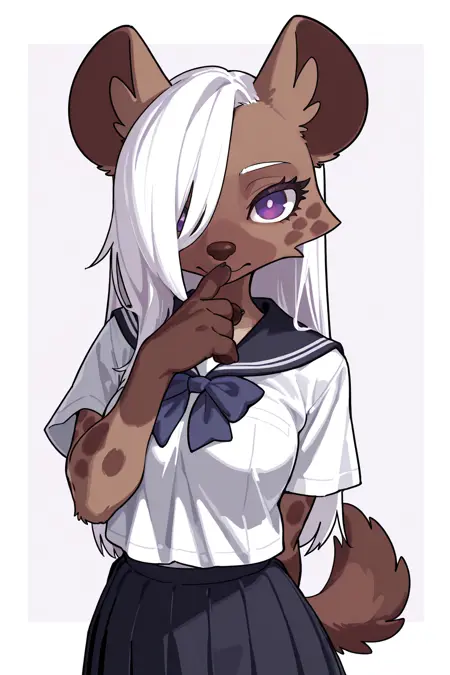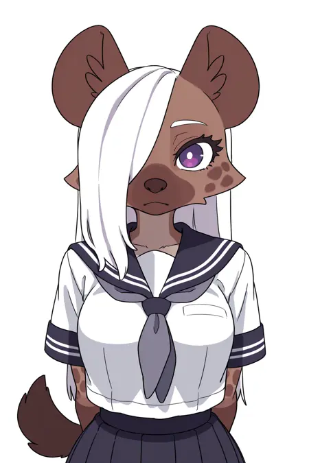 Triggers: JK, anthro, hyena, spotted hyena, female, brown body, brown fur, finger claws, eyelashes, white hair, hair over eye, school uniform, kemono, purple eyes, long hair, tail