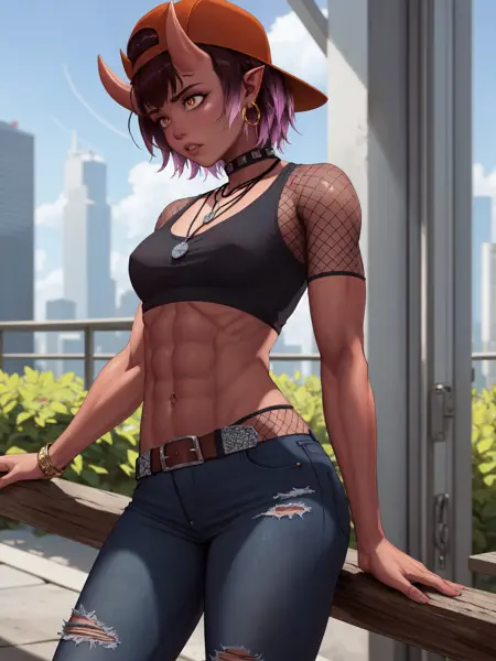 backwards hat, spikes, choker, collar, necklace, hoop earrings, black gloves, fingerless gloves, crop top, fishnets, ((fishnet top)), belt, denim jeans, torn jeans" 注意:"fingerless gloves" 仍可能导致手指生成困难。降低权重可获得更好的其他服装效果,但即使在较高权重下也具有很高的灵活性。