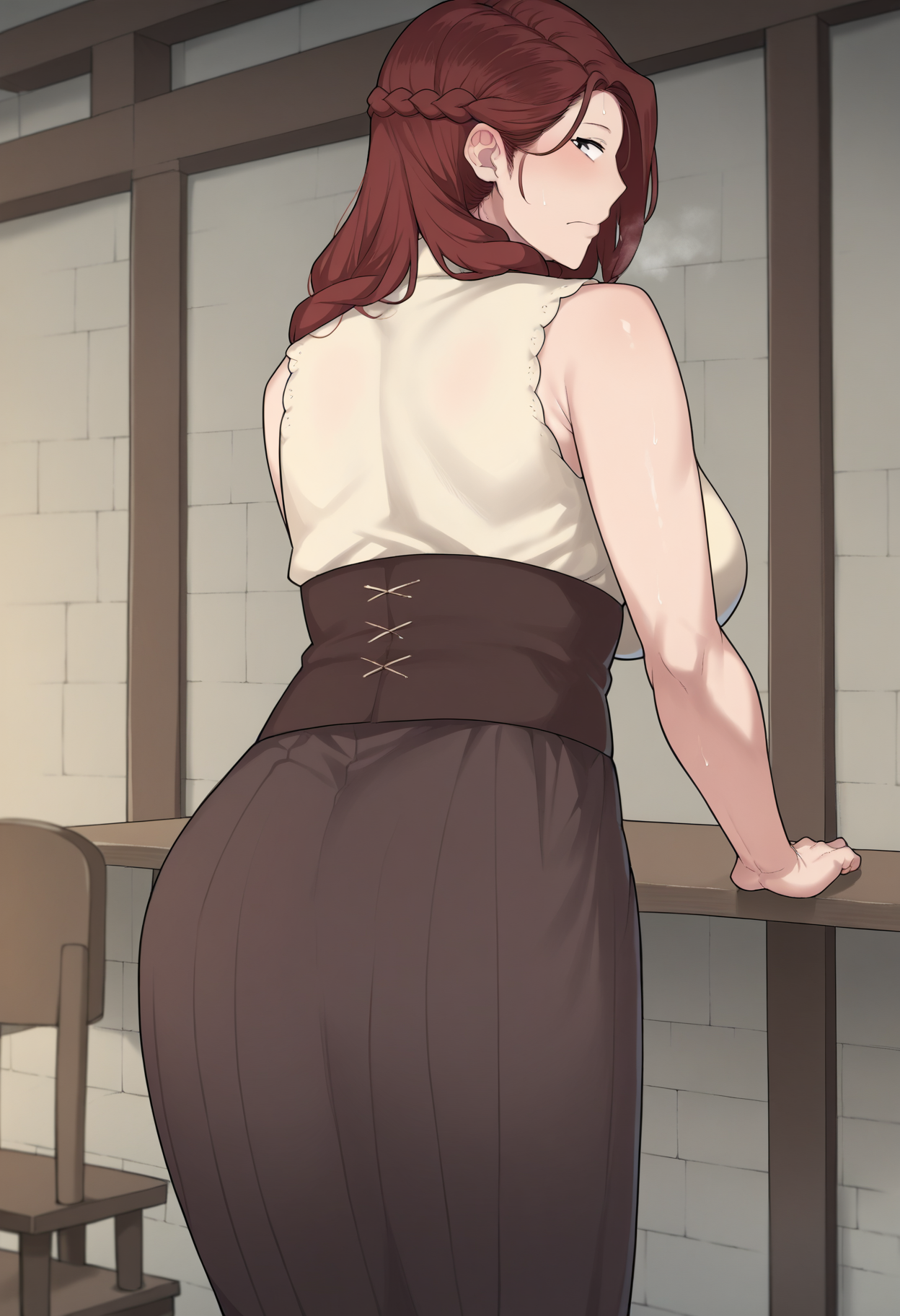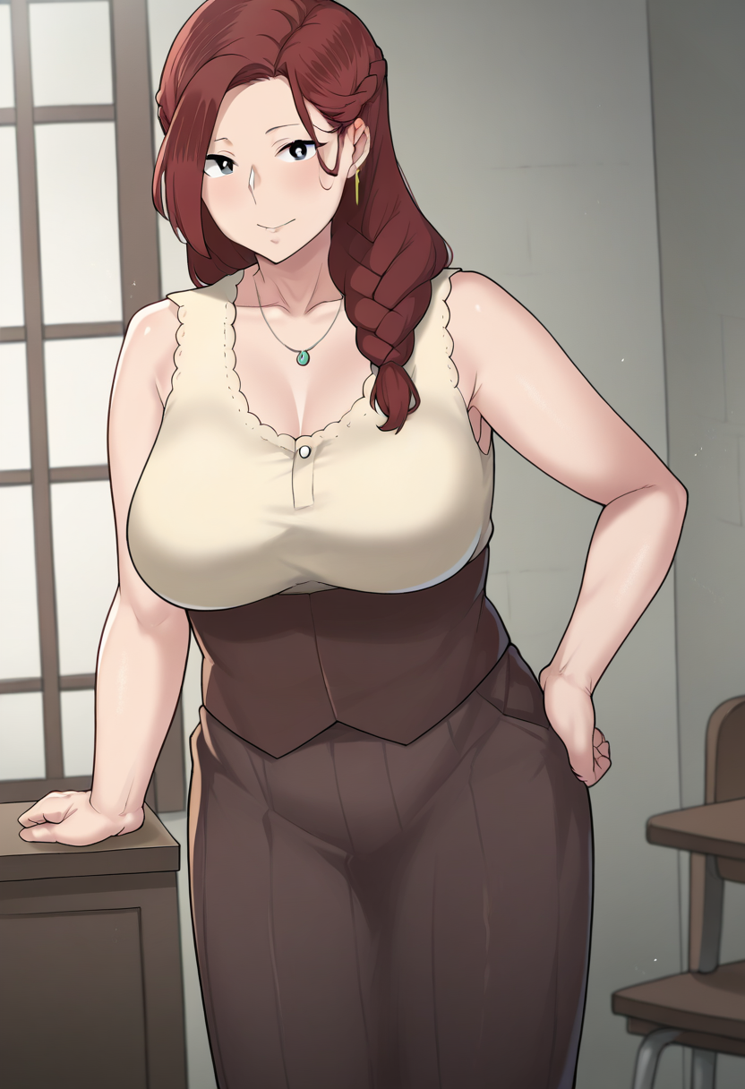 score_9, score_8_up, score_7_up, score_6_up, score_5_up, score_4_up, masterpiece, source_anime, 1girl, c-mira, black eyes, red hair, long hair, braid, mature female, beige sleeveless shirt, dark brown underbust, brown long skirt, looking at viewer, indoors,