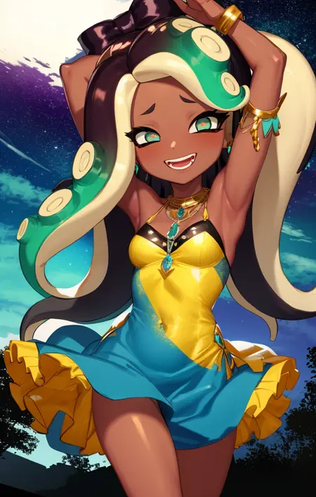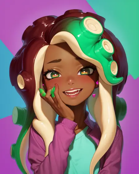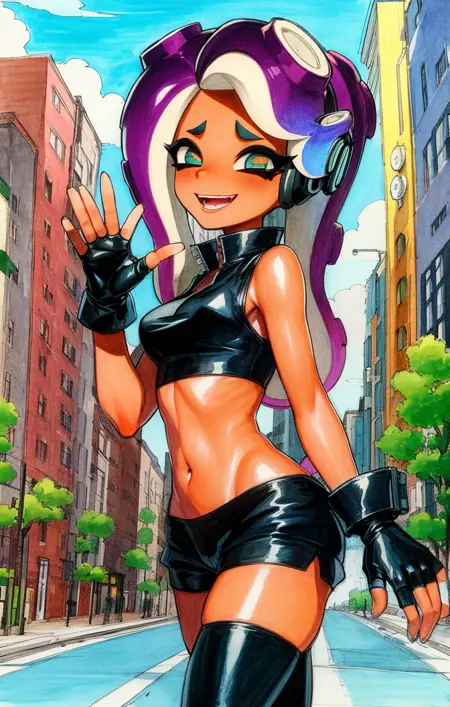 '마리나 [스플래툰], 검은 피부, 파란 레깅스 위에 검은 반바지, 크롭탑' - 그녀의 기본 옷차림을 위한 예시 프롬프트. 정상적인 머리카락을 원하신다면 '촉수 모양 머리카락'을 사용하세요.