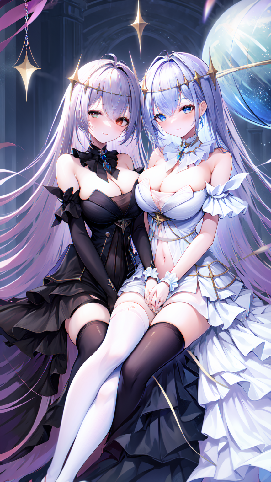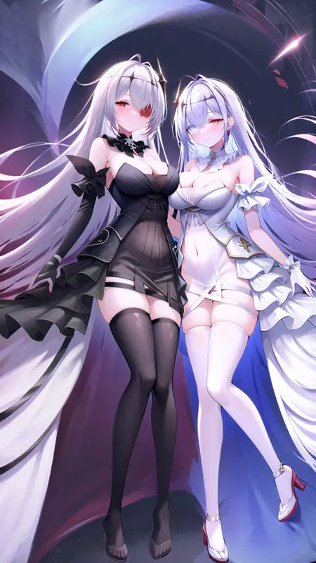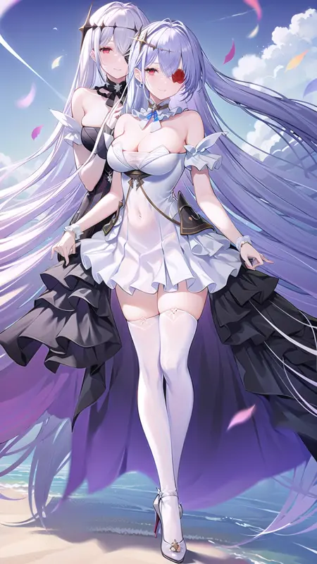 (2girls, multiple girls:1.2), flower, breasts, red flower, white flower, flower over eye, dress, black dress, long hair, rose, red eyes, red rose, blue eyes, thighhighs, white dress, white rose, white hair, very long hair, bare shoulders, bangs, hair ornament, eyepatch, white thighhighs, black gloves, lora:EmdenV1.0:0.8, (ironemdenbeide:1.2), full body, blue sky, clouds, sky background, standing on beach,