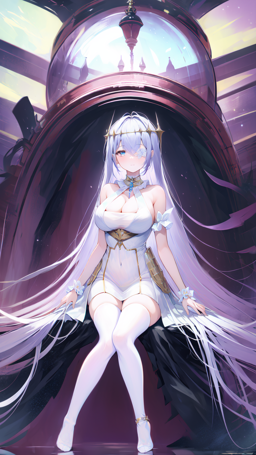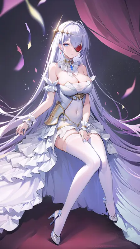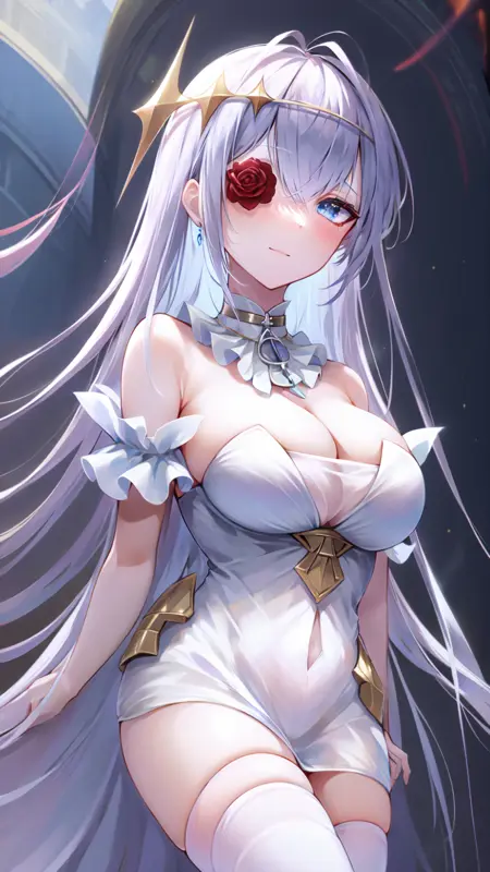 masterpiece, best quality, (1girl, solo), white rose, blue eyes, white dress, white hair, white thighhighs, white flower over eye, hair ornament, bare shoulders, cleavage, strapless dress, eyepatch, hair between eyes, ahoge, detached collar, lora:EmdenV1.0:0.8, ironemdenweiß,