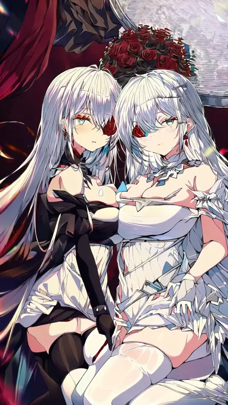 masterpiece, best quality, (((2girls, multiple girls))),((red eyes, red flower, red rose, white hair, black dress, black thighhighs, black gloves, flower over eye), (white flower, white rose, blue eyes, white dress, white hair, white thighhighs, flower over eye)),lora:EmdenV1.0:0.8, ironemdenbeide,