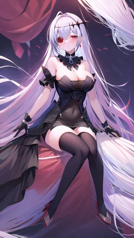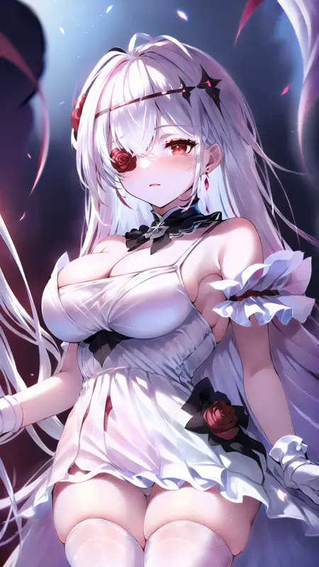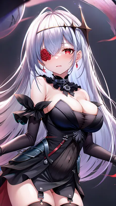 masterpiece, best quality, (1girl, solo), red eyes, red flower, red rose, white hair, black dress, black thighhighs, black gloves, flower over eye, hair ornament, bare shoulders, cleavage, strapless dress, eyepatch, hair between eyes, ahoge, flower, detached collar, lora:EmdenV1.0:0.8, ironemdenschwarz,