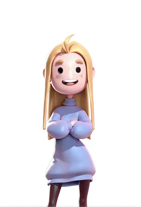 「3Dクレイマネーションスタイル」 トリガー付きの3Dスタイル:savannahXYZ, 1girl, solo, long hair, black dot eyes, looking at viewer, open mouth, blonde hair, dress, standing, pantyhose, teeth, blurry, flat chest, sweater, hand on hip, blurry background, upper teeth only, watermark, pointing, freckles, 3D claymation style,