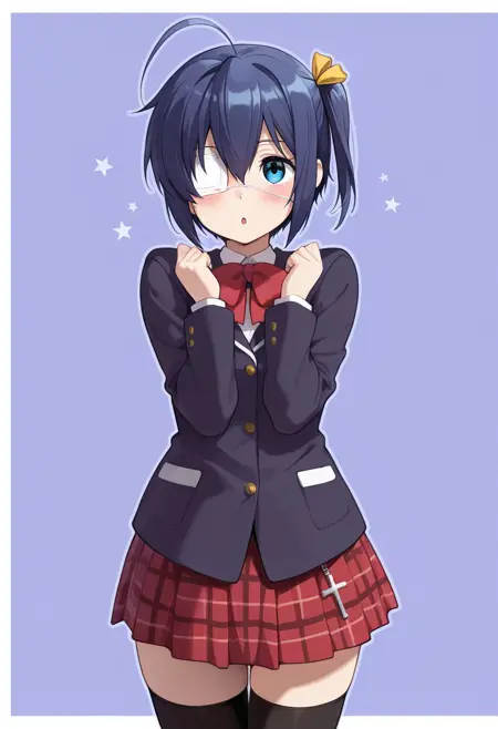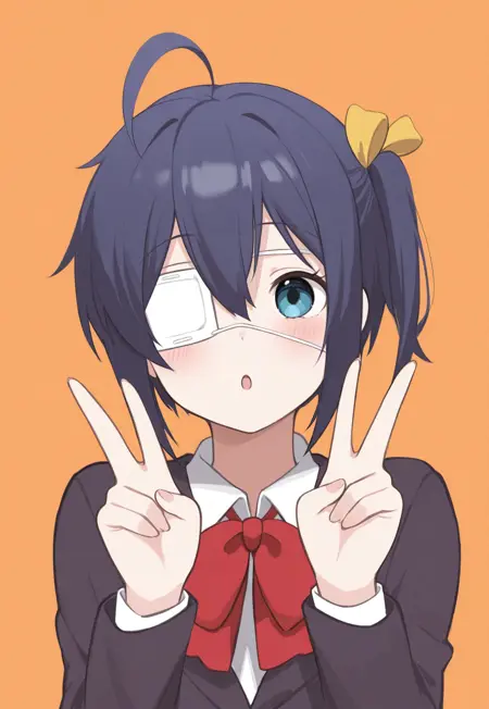 Rikka, short hair, ahoge, (medical eyepatch:1.2), blue eyes, blue hair, yellow ribbon, hair ribbon, bangs, hair between eyes, small breasts,