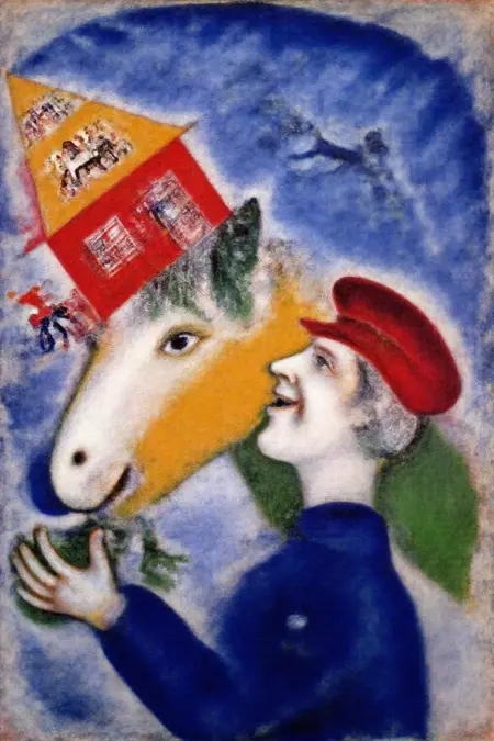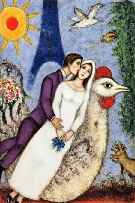 - 鲜明色彩:夏加尔的调色板以强烈的情感表现力著称,大胆而明亮的色彩传达情绪与象征意义。
