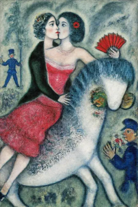 - 一幅充满童趣与浪漫的画作,描绘夏加尔与妻子贝拉·列文娜·罗森菲尔德,象征他们深厚的爱。