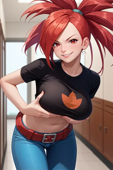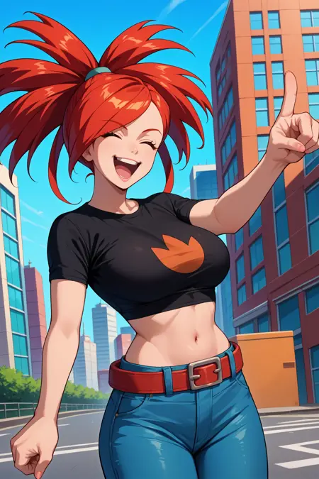 Add "rsefl, red hair, red eyes, high ponytail, big hair, large breasts, black t-shirt, cropped shirt, short sleeves, midriff, red belt, jeans" for her original look.