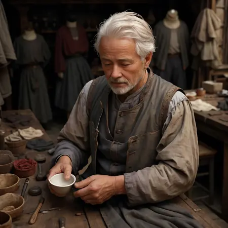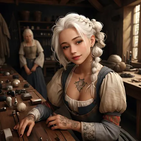 1boy, 1girl, apron, bald, bare shoulders, beard, belt, black dress, black hair, black nails, blonde hair, blue eyes, blurry, blurry background, book, bracelet, braid, breasts, brown eyes, brown hair, candle, chair, cleavage, closed eyes, clothes around waist, coin, collarbone, corset, cross, cup, dark skin, depth of field, dress, earrings, facial hair, flower, food, freckles, glasses, green eyes, grey hair, grin, holding, jacket, jewelry, lamp, lips, long hair, long sleeves, looking at viewer, looking down, male focus, medium breasts, messy hair, mole, mustache, nail polish, necklace, night, old, old man, one eye closed, open mouth, pants, parted lips, puffy short sleeves, puffy sleeves, quill, reading, realistic, red hair, ring, sash, scar, shirt, short sleeves, sitting, small breasts, smile, solo, solo focus, sunlight, table, tailor, tattoo, teeth, upper body, vest, watch, wavy hair, white dress, white hair, white shirt, window, wrinkled skin