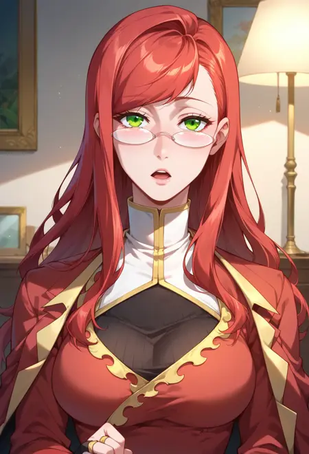 LuoYunshangV1, red hair, green eyes, long hair, choppy bangs, glasses,