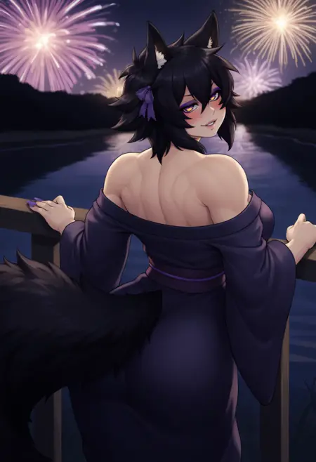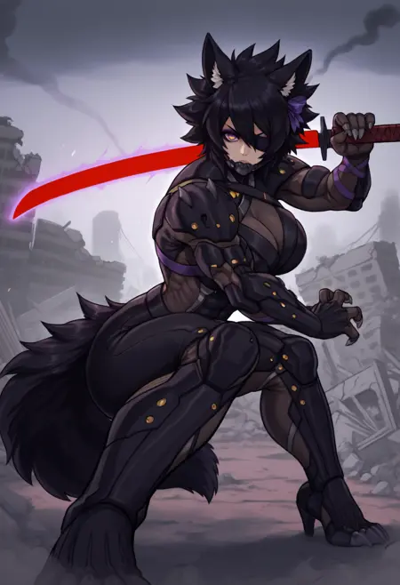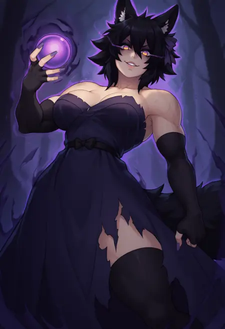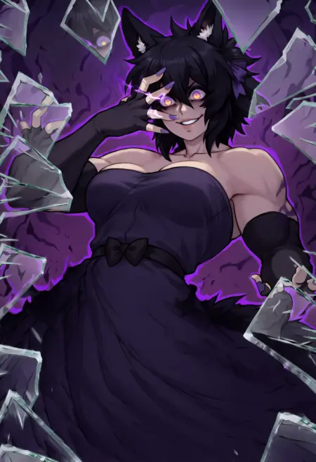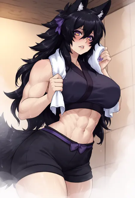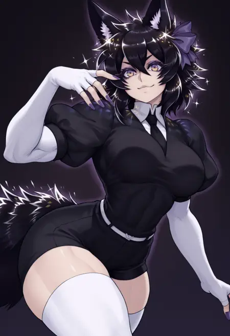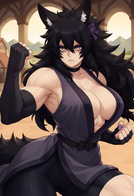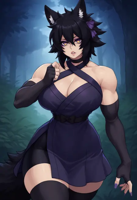 "늑대 소녀, 동물 귀, 다색 안구, 아이섀도우, 늑대 꼬리, 검은 머리, 단발, 눈 사이 머리카락, 큰 가슴, 근육질 여성, 네일아트, 보라색 리본, 머리 리본" — 정확성을 위해 항상 포함해야 합니다.