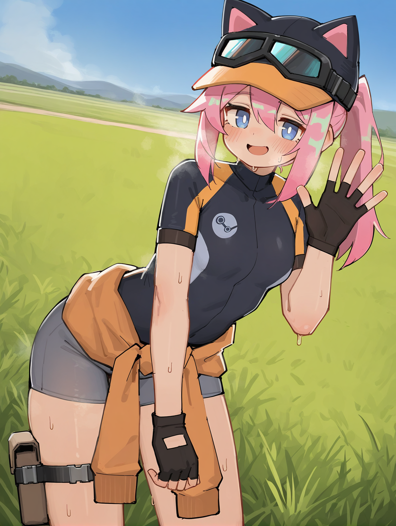 steamdeliveryGirl, 1girl, solo, pink hair, blue eyes, animal ears, long hair, ponytail, white pupils, hair between eyes, steam logo, steam icon, steam symbol, gloves, black gloves, hat, goggles, fingerless gloves, eyewear on headwear, jacket,goggles on headwear, short sleeves, black headwear, thigh strap, clothes around waist, baseball cap,