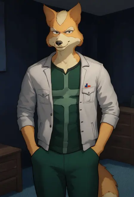 Fox McCloud, anthro, fox, mature male, animal ears, tan yellow fur, thick eyebrows, green eyes, athletic build
