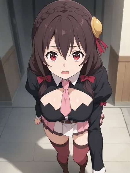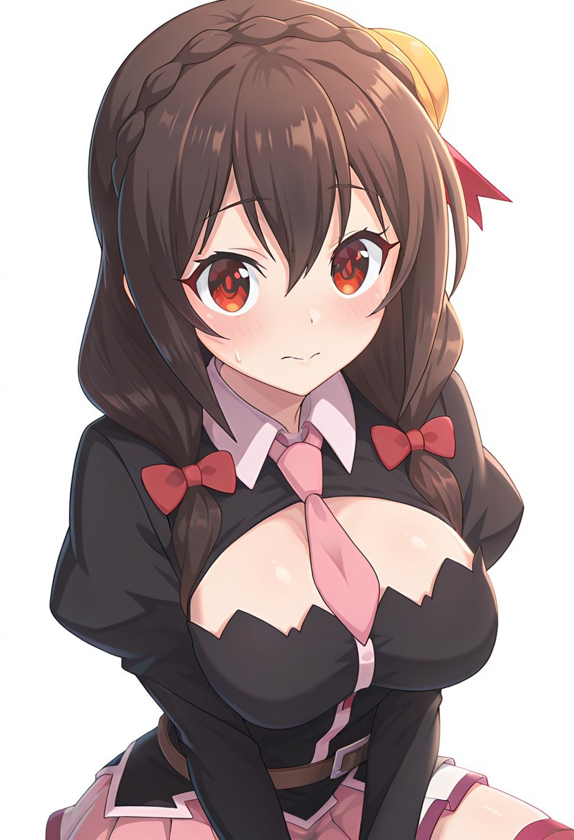 提示:1girl, solo, Yunyun-Liver020, red eyes, brown hair, pink necktie, red thighhighs, long hair, black shirt, large breasts, pink skirt, white skirt, brown hair, black hair, long sleeves, hair ornament, red eyes, thighhighs, bow, ribbon, hair between eyes, twintails, braid, hair bow, pleated skirt, brown boots, puffy sleeves, brown belt, miniskirt, red bow, clothing cutout, cleavage cutout, juliet sleeves, pink skirt, crown braid
