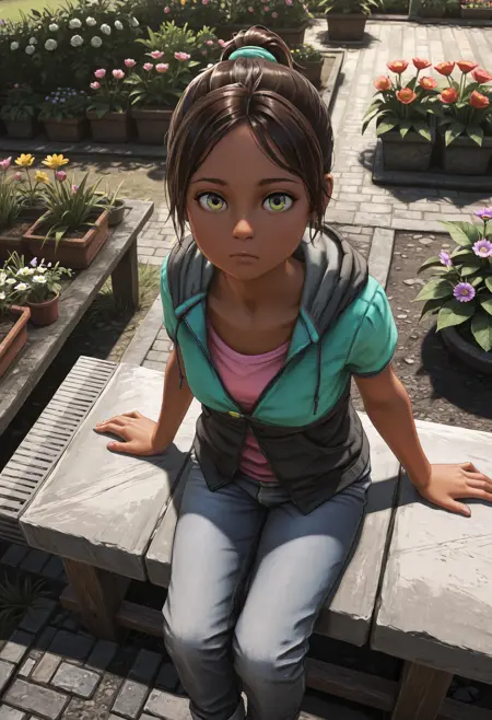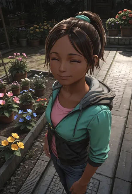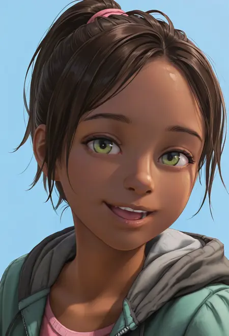 bhadraf, 1girl, brown hair, short hair, ponytail, dark skin, dark-skinned female, lips, green eyes, hoodie, jacket, jeans, pants, hood down, bracelet, shirt