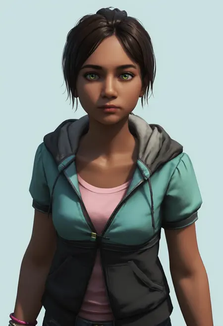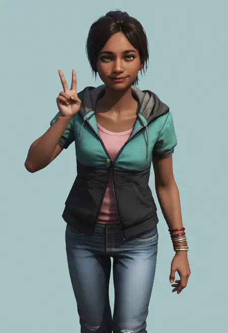 bhadraf, 1girl, brown hair, short hair, ponytail, dark skin, dark-skinned female, lips, green eyes, hoodie, jacket, jeans, pants, hood down, bracelet, shirt