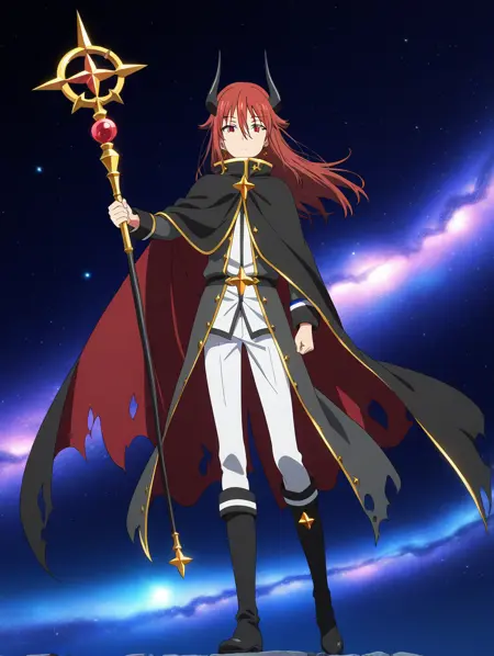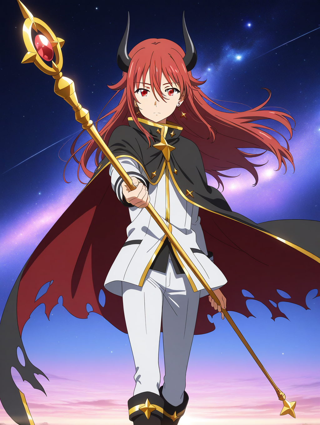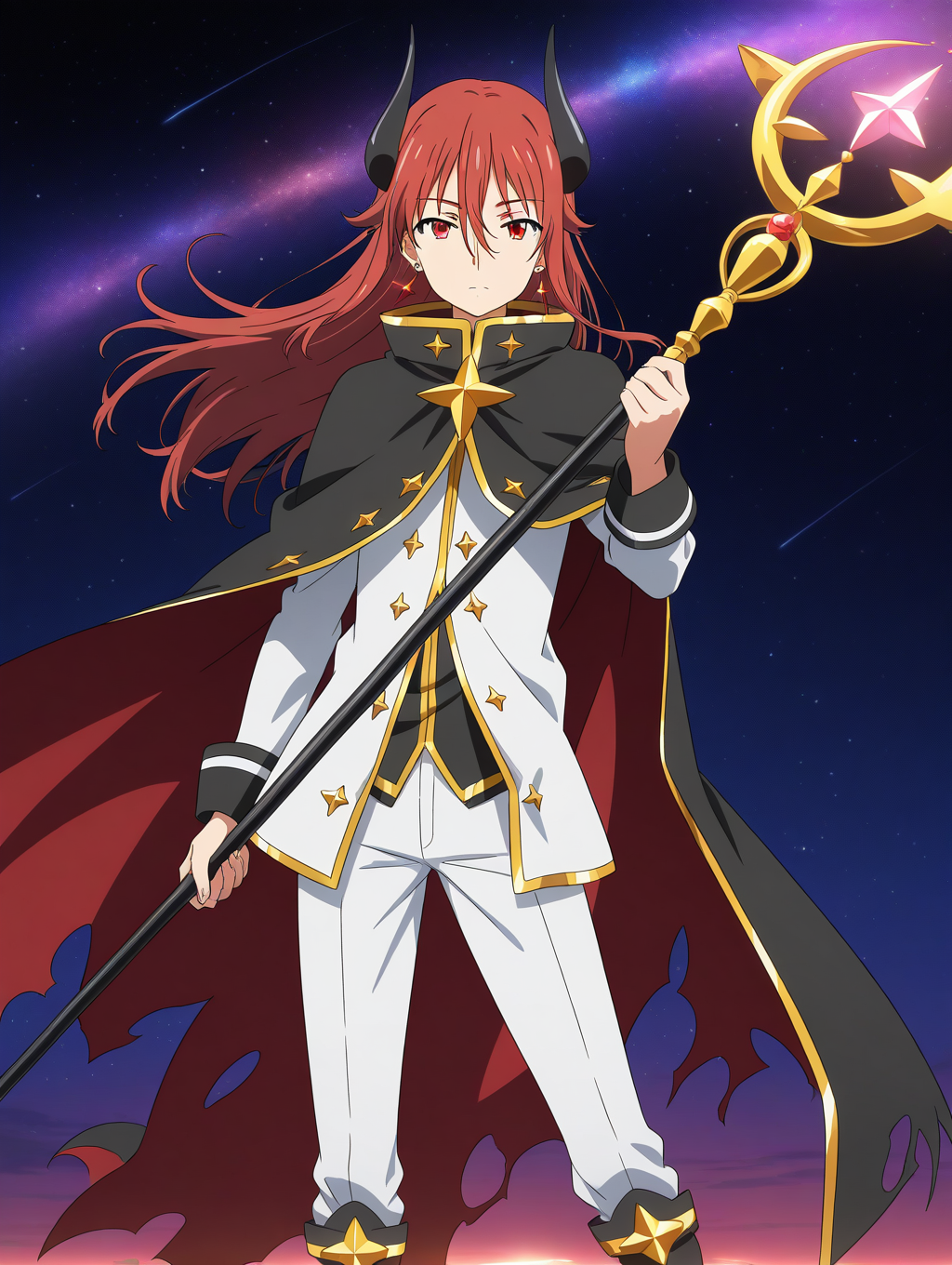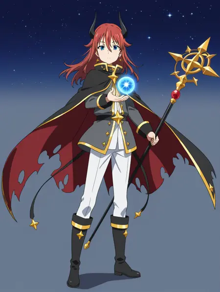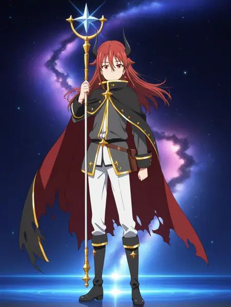 solo,, 뿔, 긴 머리, 시청자 바라보기, 바지, 갈색 머리, 망토, 흰 바지, 검은 신발,