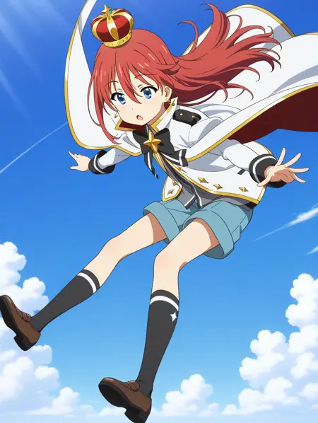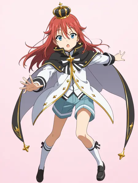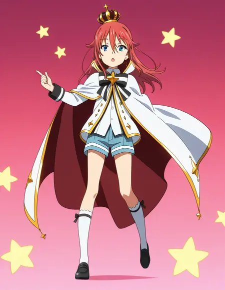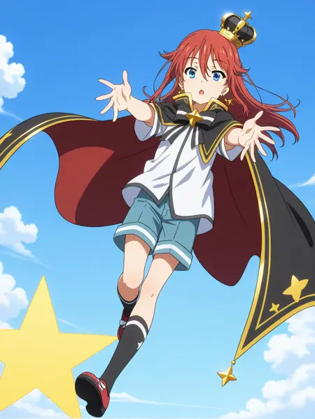 별(기호), 왕관, 벌어진 입, 파란 반바지, :o, 활, 망토, 남성 중심, 전체 몸, 신발, 양말,