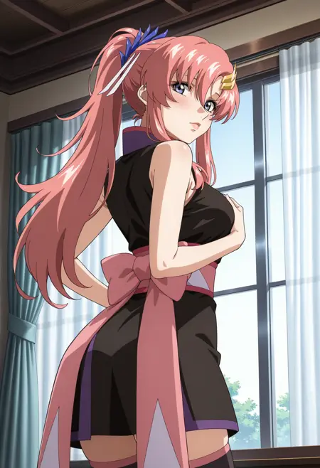 ベース:lacus_c、1girl、アニメ風カラーリング、シングル、ロングヘア、高いポニーテール、ピンクの髪、ヘアアクセサリー、髪のリボン、目の中の髪、紫の瞳、リップ、ブラックのノースリーブきもの、帯、ブラックの太ももハイズ、中サイズの胸