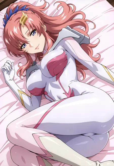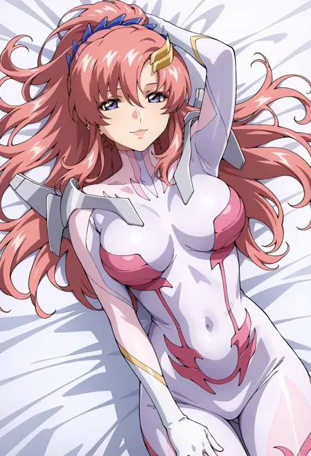 Base: lacus_c, 1girl, anime coloring, solo, long hair, pink hair, hair between eyes, purple eyes, lipstick, lacus pilot suit, pink white bodysuit, shoulder armor, pilot gloves, large breasts,