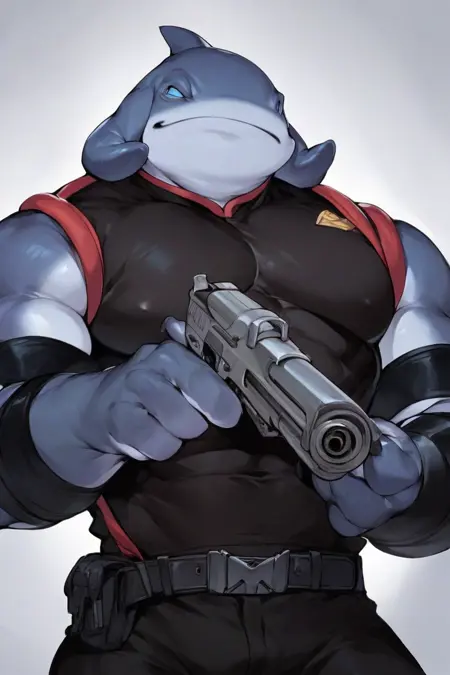 male, furry, shark, gantu, Dark suit, belt, sleeveless cut, black sleeveless shirt, black pants, black bracelets, blue pupil-less eyes,