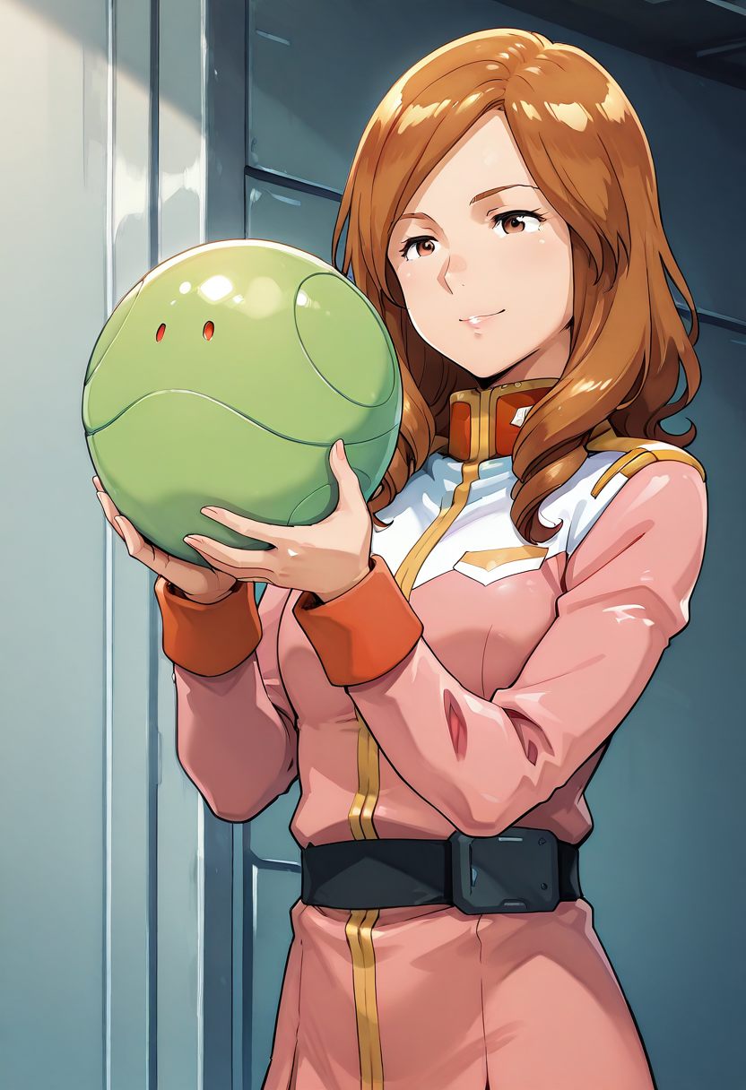 이것은 건담 시리즈의 마스코트 캐릭터인 하로를 들고 있는 사람의 그림입니다.
