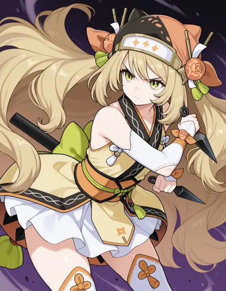 그녀의 닌자 외모를 위해 "hat,bridal gauntlets,sleeveless kimono,obi,white skirt,thighhighs,tabi"를 추가하세요.