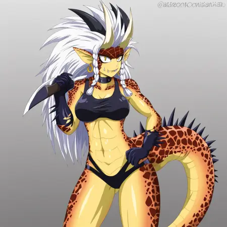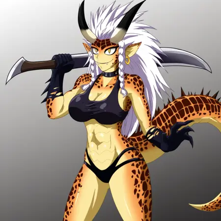 RaptoraOPM,1个女孩,独身,怪物女孩,爬行类女孩,龙女孩,鳞片,曲线身材,非常长的头发,浓密的头发,白发,蓬松的头发,凌乱的头发,两条辫子,耳朵,尖耳朵,耳环,发饰,黄色眼睛,尖牙,身体部分覆盖鳞片,大胸,两只角,肚脐,腹部,腹股沟,锁骨,腹肌,二头肌,胸罩,黑色双背带内裤,黑色高跟靴,彩色皮肤,尾巴,项圈,带有金属尖端的黑色项圈,宽臀,武器,菜刀,獠牙,带尖刺的黑色手套