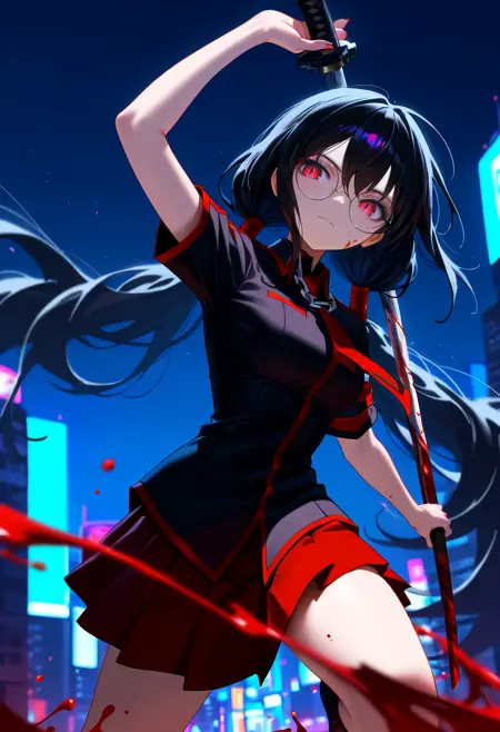 black shirt, red trim, chain jewelry, red necktie, pleated skirt, short sleeves, black armband, round eyewear, red skirt, layered skirt,